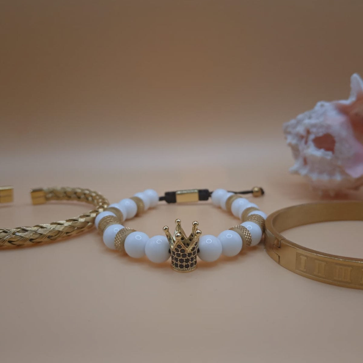 Brazalete romano, brazalete trenzado en dorado, brazalete de cuencas blancas sobre hilo negro con corona adornada en circonias negras.